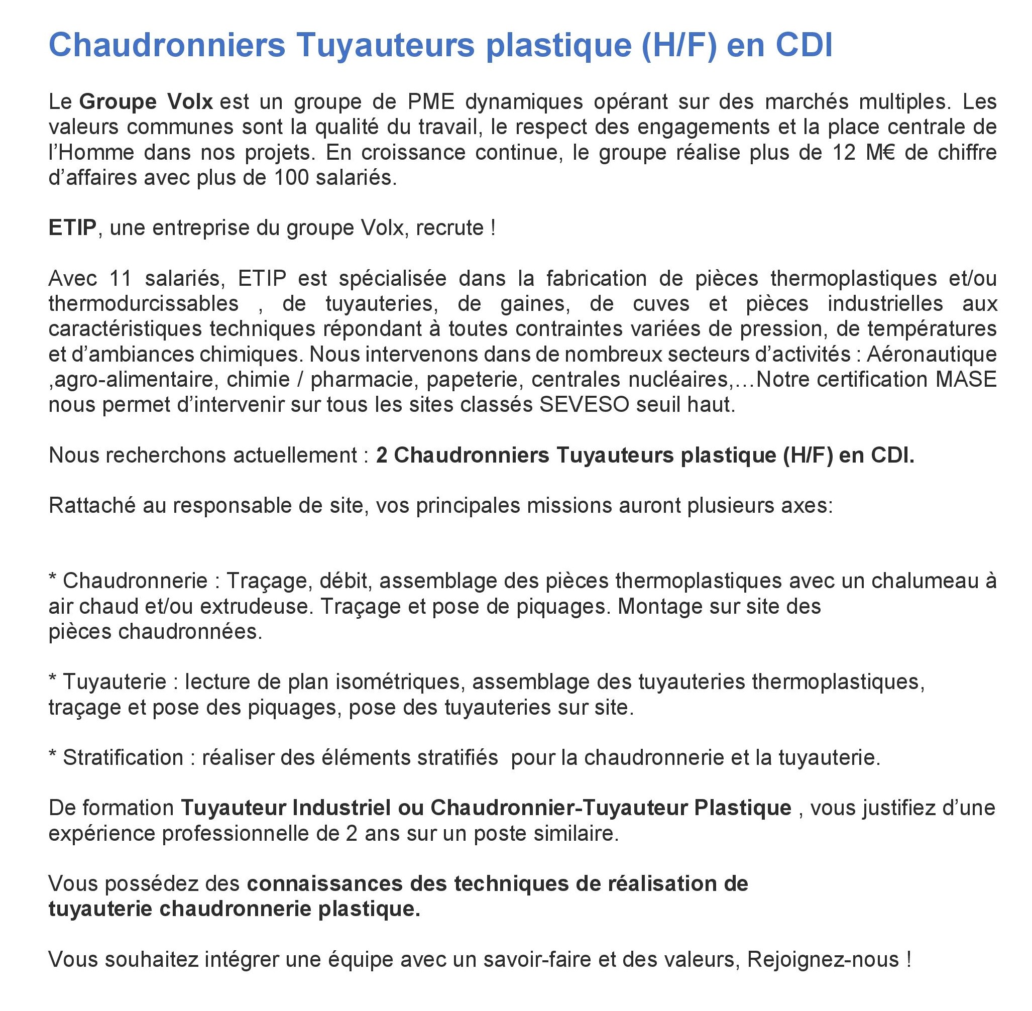 - Chaudronnier/tuyauteur plastique niveau intermédiaire et confirmé